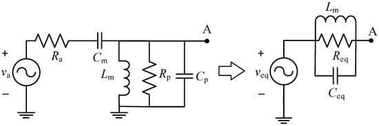 As for the inductor, connected between node A and ground at Figure 2, the left-hand circuit of Figure A2 shows the manufacturer model, where . Using the series-to-parallel circuit transformation, the circuit in the middle is obtained, where: