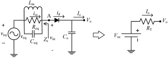 Next, the Thévenin equivalent of Figure 3 is linked to the next stage of the rectenna, the rectifier, resulting in the left-hand circuit of Figure 4, where the diode does not include its parasitic elements since they have been already considered in the previous derivation (they are included in Req and Ceq). The diode is forward biased when vin, assumed sinusoidal, surpasses Vo. As a result, id is pulsed and is composed of the fundamental frequency (fo) as well as its harmonics and a DC component (Io). Impedance Zs (defined in the circuit) is zero at DC (due to the coil Lm) and is equal to Req at fo since Lm and Ceq form a parallel resonant circuit presenting an infinite impedance. On the other hand, at the harmonics of fo we have Zs << Req (due to Ceq) whenever Q is high enough. Therefore, only the current at fo (iin) originates a voltage drop and vin will be sinusoidal, as assumed before. Thus, apart from boosting the voltage, the matching network ideally acts as an input band-pass filter that prevents any of the DC current and harmonics to flow through the antenna resistance and dissipate power. This leads to an ideal rectenna efficiency of 100%, assuming no losses in the circuit components and in the diode [34]. Contrariwise, when no matching network is present, maximum rectenna efficiency decreases to 46%, due to the additional losses at Ra originated by the current harmonics generated by the diode pulsed current, as demonstrated in [35]. Appendix B confirms these results via simulations. Finally, the value of Co has to be much higher than the diode junction capacitance (Cj), as explained in Appendix A, to keep Vo nearly constant, that is, with a low voltage ripple (ΔVo). This second condition leads to: