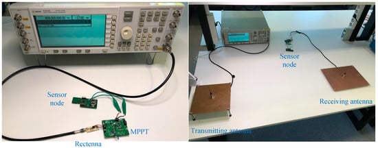 For demonstration purposes, the RF harvester including the MPPT was also employed to power a sensor node intended to upgrade a mechanical gas meter to a smart device [38]. For these tests, the node was programmed to stay in a standby mode, consuming 1.4 µA. The input power (Pav) was set to keep the voltage supply of the sensor node (Vload) at 3 V, thus Pload = 4.2 µW. As for the RF harvester input, two configurations were used: (1) an RF generator and (2) a receiving monopole antenna. In the second case, another identical monopole antenna was connected to a nearby RF generator, jointly acting as a wireless energy transmitter. The antennas showed an insertion loss higher than 10 dB at 808 MHz. Figure 6 shows pictures of both setups.