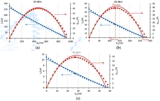 Measured values (dots) and least-squares fittings (continuous lines) of Io and ηrect versus Vo for the rectenna at Pav equal to (a) −10 dBm, (b) −20 dBm, and (c) −30 dBm.