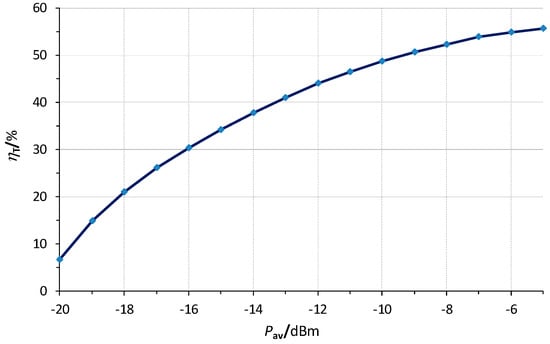 With Cm = 0.5 pF, Ra = 50 Ω, and fo = 808 MHz, Q = 7.88 results from (3), and Gt = 3.97 from (2). Then, from (16) and assuming the value of Rp = 9.21 kΩ derived in Appendix A, RT = 4.7 kΩ is obtained, which is within the range of values found in Table 1. The inferred values of RT moderately change with Pav due to the relative low value of Q, which limits the accuracy of the rectenna model proposed in Section 2. However, a higher value of Q, which could be obtained using a lower value of Cm and appropriately readjusting Lm, does not lead to the optimum gain Gt [33], thus decreasing the power efficiency. On the other hand, Voc in Table 1 increases with increasing Pav and thus Vap, which agrees with (16). The values of Voc can be estimated in advance, when necessary, from (16) by calculating Veqp from (15), shown in Table 1, and inferring a value of Vγ from the manufacturer data or from simulations.
