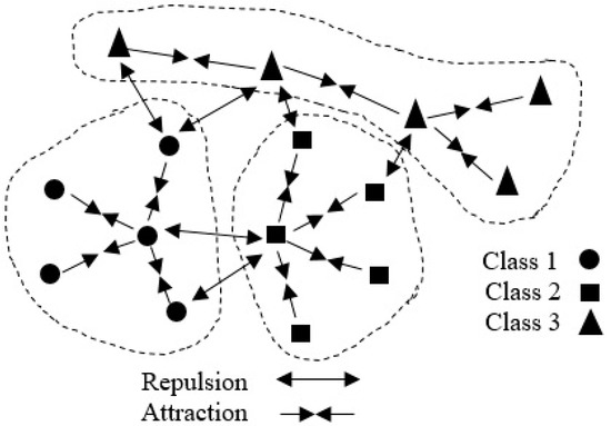 The interactions by attraction and repulsion for the points between different classes.