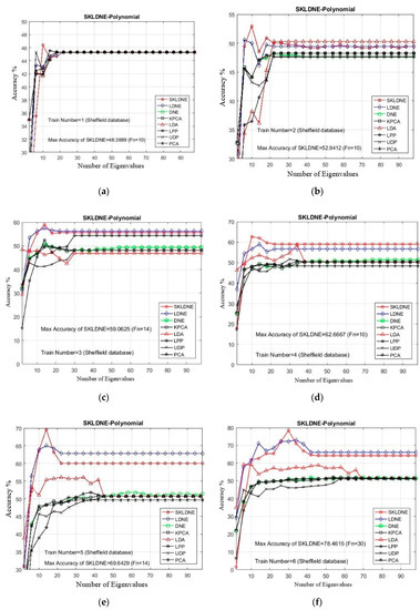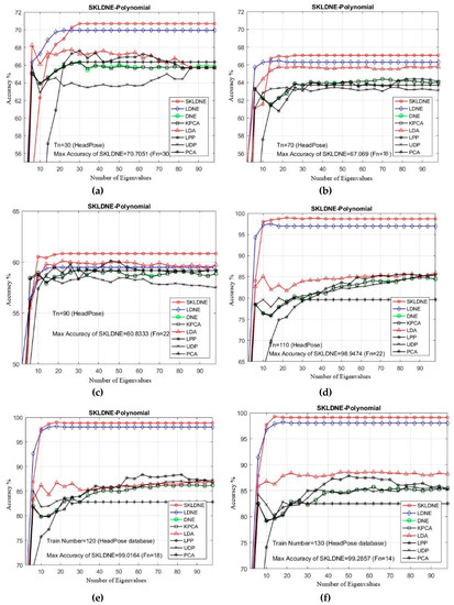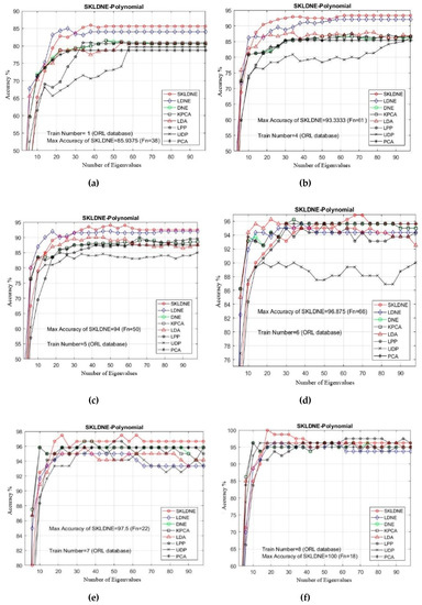 In our experiments, the number of training samples Tn = 1, 4, 3, 4, 5, 6, 7, 8 were chosen from the dataset related to each subject to make the training sample set. The other numbers of images are applied as a testing sample set. As already mentioned, PCA was used in the classification phase in all methods. The maximal average accuracy (in percentage terms) and its corresponding dimension, followed by the alteration in the training sample sizes, are illustrated in Table 3. It can be observed in this yable and in Figure 7a–f that SKLDNE generally outperformed LDNE, whether the number of training sample size was small or not, in almost smaller numbers of dimensions. Moreover, as a supervised method, SKLDNE also significantly outperformed other techniques (KPCA, LPP, DNE, UDP, and LDA) regardless of the change in the training sample size. Compared to other techniques, SKLDNE performed better in small training sample size case. Furthermore, when the training number was equal to 8, SKLDNE had a zero error rate compared to that of PCA (4.1%), KPCA (3.5%), UDP (4%), LPP (3.5%), LDA (4%), DNE (3.75), and LDNE (3.5%). SKLDNE can simultaneously discover interclass and intraclass geometrical information, and have more nonlinear data representation, locality preservation, and discriminating power than other techniques. Therefore, SKLDNE does have merit over other techniques in terms of resolving classification problems in face recognition. This characteristic of SKLDNE in small sample size cases is indeed important to improve the recognition rate in practice, since face recognition is commonly a small sample size problem. Normally, a small number of images of each person is accessible in many real-world tasks.