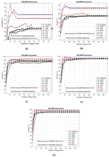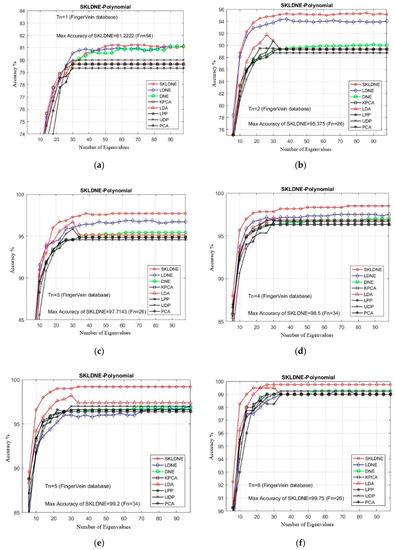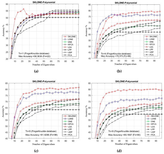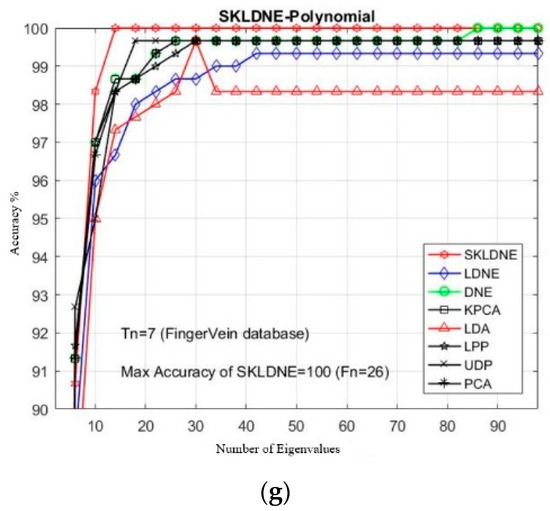 Table 6 shows that the SKLDNE recognition performance was significantly more efficient than other techniques, regardless of the variation in the training sample size, in the Finger Knuckle database. The recognition rate of SKLDNE when Tn = 11 was equal to 100%, while for the LDNE it was equal to 97.2%. Another point that is worth mentioning on the comparison of recognition performance in SKLDNE and other methods is related to the small training sample size case, as SKLDNE had the best performance in this respect. Again, all best recognition performances of SKLDNE were almost achieved at smaller values of dimension on every Tn per data set. It can also be observed that, when the given training sample size of each class became larger, SKLDNE achieved much better results than other techniques. For example, for Tn = 6, the accuracy of SKLDNE was around 8% and 21% more than LDNE and PCA, respectively. In order to well explain the superiority of SKLDNE, it should be noted that it can preserve more effective nonlinear features and more geometrical and discriminant information so, it can tackle the small sample size, the out-of-sample, and the “overlearning of locality” problems. Hence, it can be concluded that the SKLDNE approach is a promising supervised technique with a satisfactory performance of classification in order to be applied in the Finger Knuckle database. The recognition rates in comparison with the variation of dimensions for each Tn are shown in Figure 13a–i.