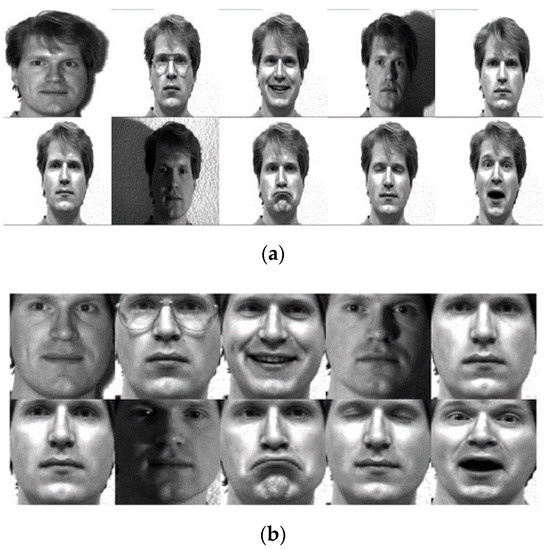 The Yale face database [53] consists of 165 images (grayscale) taken from 15 people [54] under diverse facial expressions and light conditions. The data include 11 images for every individual, with various facial expressions or environmental conditions, such as: normal, wearing glasses and no glasses, center-light, left and right light, happy, winking, sleepy, surprised, and sad. In the experimental results, every image was first cropped and then was resized to 32 × 32 pixels [55]. Figure 4a,b illustrates some sample images of one individual of the Yale database and corresponding cropped images.