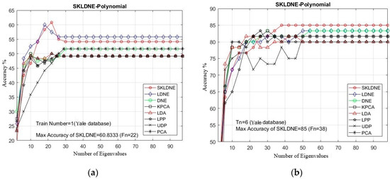 PCA was used in all methods for feature extraction, and all methods include a PCA phase. The optimum rate of recognition of each technique and the equivalent dimension implemented in the Yale database are illustrated in Table 2. Furthermore, in all experiments, due to the large quantity of implementations, it was decided to select some training and testing images that were more challenging for the classification task to clarify the performance of the aforementioned dimensionality reduction techniques in these critical areas. Considering the small training sample size problem (SSS), we first selected a training number of 1 sample and then some larger numbers from 6 to 9 to evaluate the performance of our SKLDNE method in some common existing problems such as the SSS problem and the out-of-sample problem.