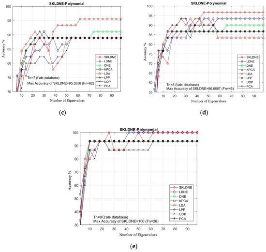 Table 2 shows that the SKLDNE method achieved the highest accuracy in 100% of implementations in the Yale Database. In Figure 5a–e, the comparative classification accuracies are plotted for each given Tn (training number) in each dataset through changing the dimensionality of the transformation matrix. As is shown, the recognition rate of each technique increased promptly till the dimensionality was almost 40, and then it stabilized. It can be observed in Table 2 that SKLDNE was implemented more efficiently than others among a wide variety of dimensionality in the Yale Face database. Meanwhile, the best implementation of SKLDNE was achieved at a smaller dimension value in most of training numbers for each data set compared to LDNE. Moreover, differences in the classification between SKLDNE and other methods are very clear, especially when training number was small, for instance, Tn = 1, 2. For training number 7, SKLDNE yielded an improvement of around 4.5% compared with DNE, LPP, LDA, and KPCA, and 6.6% in comparison with LDNE, UDP, and PCA respectively. For training number 9, both SKLDNE and LDNE gained 100% accuracy, while accuracies in other methods with the same training number were much lower. In order to explain the superiority of the proposed method, our SKLDNE first mapped the data in the kernel space to capture the substantial extracted data and then both geometrical and discriminant information of the data were taken, benefiting from a significant form of the affinity weight matrix to embed the graph. Although LPP, DNE, and LDNE outperforming PCA, KPCA, and UDP demonstrates that the discriminant and local data structure based methods are more suitable for face recognition, our SKLDNE had more nonlinear data representation, locality preservation, and discriminating power than other methods, and consequently achieved the best recognition accuracy. Therefore, based on the mentioned characteristics of SKLDNE, it can be concluded that our SKLDNE can overcome the “SSS,” “out-of-sample,” and “overlearning” problems.