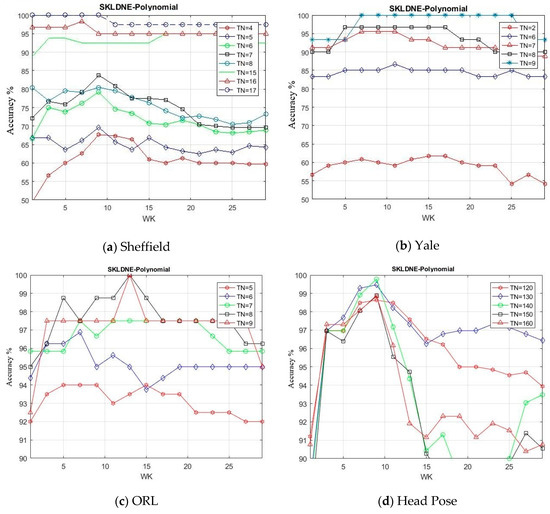 It can be seen that the classification performance became better as the number of training samples increased. The classification performance of SKLDNE improved first with a rise of Wk until almost Wk = 9 in the Sheffield and Head Pose, and then it decreased dramatically. In the Yale, ORL, Finger Vein, and Finger Knuckle datasets, it can easily be observed that the recognition performance of SKLDNE enhanced rapidly when Wk varied from 1 to 7 in Yale, 1 to 10 in ORL, 1 to 9 in Finger Vein, from 1 to 6 in Finger Knuckle, and then it decreases when Wk became larger, since large values of k-neighborhood variable Wk have an effect on creating the weight adjacent matrix. It has already been proven that the k-neighborhood selected for data point might contain more outliers belonging to other classes at a large number of Wk when a dataset includes many classes with a small number of samples for each class. Thus, the constructed adjacent weight matrix does not have sufficient discrimination for image recognition [15].