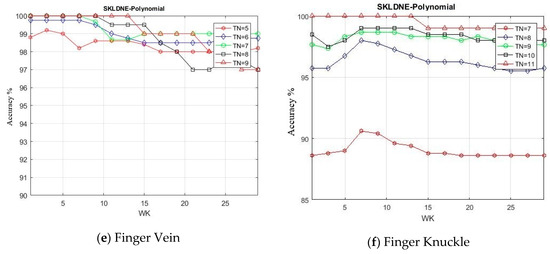 In this section, by means of a new group of experiments, we evaluated SKLDNE performance through changing k-neighborhood variation Wk (from 1 to 30 with a scale of 2). The number of training samples selected for each database were Tn = 4, 5, 6, 7, 8, 15, 16, 17 in Sheffield, Tn = 2, 6, 7, 8, 9 in Yale, Tn = 5, 6, 7, 8, 9 in ORL, Tn = 120, 130, 140, 150, 160 in Head Pose, Tn = 5, 6, 7, 8, 9 in Finger Vein, and Tn = 7, 8, 9, 10, 11 in Finger Knuckle databases. It should be noted that the rest of each class in each dataset was used for testing. The training number samples were randomly selected. The maximum recognition rates of SKLDNE in comparison with Wk for different numbers of training samples are indicated in Figure 14a–f.