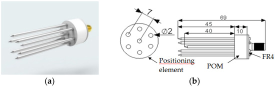 In this study, dielectric properties were measured using a seven-rod probe manufactured at the Laboratory of Dielectric Spectroscopy of the Institute of Agrophysics PAS, Lublin, Poland (Figure 1a). The sensor is equipped with seven rods made of acid-proof steel. The signal rod is surrounded by six ground rods. The rods and SMA socket were soldered to the round plate of the Printed Circuit Board (PCB) composed primarily of FR4 circuit board material. The positioning element was made of poliacetal (POM). The dimensions of the probe are shown in Figure 1b.