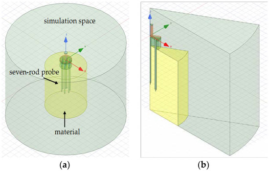 Simulations of the seven-rod probe were performed using the Ansys HFSS software pack, which uses a finite element method (FEM) for calculation [22]. The model of the simulation space is presented in Figure 2a,b.