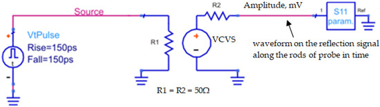 The elementary electric circuit used in the ADS [30] is presented in Figure 4, where the VtPulse is a needle pulse generator with 150 ps rise and fall times and 1 V amplitude; stands for the element of the scattering matrix imported from the VNA; and R1, R2, and the Voltage Controlled Voltage Source (VCVS) match and separate the signal path between the needle pulse generator and the probe represented by .