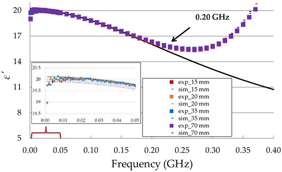 Comparison of values for isopropanol obtained from simulations (sim) and experiments (exp) for measurements in containers with different diameters (in mm). The black solid line corresponds to the Debye spectrum of isopropanol data obtained from available literature (T = 20 °C, = 29, = 3.2, τ = 292 ps) [25].