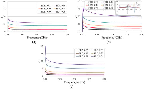 The values of SKR (a), GRT (b), and ZLZ (c) soil samples with different water contents over the frequency range from 1 MHz to 200 MHz. The name of each sample consists of the type of soil and the value. Three VNA measurements from various soil samples were performed for each moisture content. The curves present the average values with the maximum value of the standard error ± 3%.