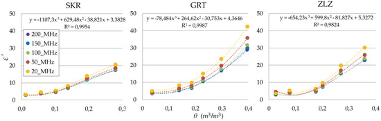 In the case of the SKR soil, the increasing frequency did not change the , except for the saturated sample. However, in other soils that contained more clay fraction, the generally differed with frequency, especially at higher . The results obtained in relation to GRT and ZLZ soils could be explained by strong water–clay interactions in low frequencies. The third degree polynomial fitted to obtained data for 200 MHz shows high for tested soils.