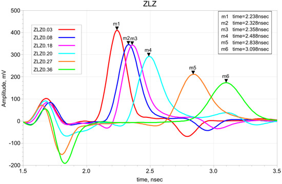 The parameters obtained from VNA measurements were used for travel time calculations using the ADS software. Examples of waveforms for different moisture contents of ZLZ soil are presented in Figure 8. The first negative reflection comes from the beginning of the probe rods and the positive second one is the reflection from the ends of the probe rods. For each sample, the travel time of the positive second reflection is presented in Figure 8.