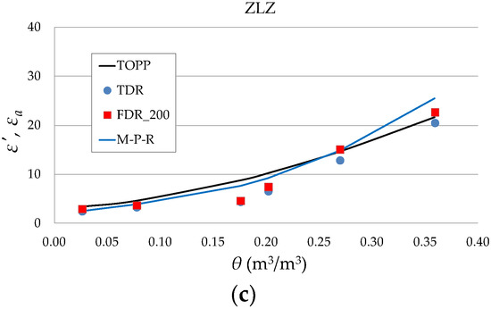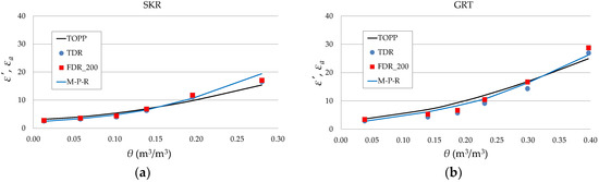 In general, Topp’s equation overestimated the values of and for GRT and ZLZ soils, except for air-dry and saturated soils. In SKR soil the values of were in line with the values from Topp’s equation and TDR up to = 0.14 m3/m3. As noted in the available literature. the equation proposed by Topp [10] does not fit well in the case of fine-grained soils [36] and any soils with high organic matter content [37]. This may occur due to the increase in the specific surface area of the soil with the increase in clay content, which is the reason for significant influence from the adsorbed layer of water. Hence, there are ongoing efforts to develop equations that better describe the relations between dielectric permittivity and soil water content by taking into account their physical properties. The calibration proposed by M-P-R takes into account the density of the material in calculations of permittivity. As can be seen in Figure 10, the applied density correction provided higher values of dielectric permittivity for GRT and ZLZ soils which were closer to those from Topp’s equation.