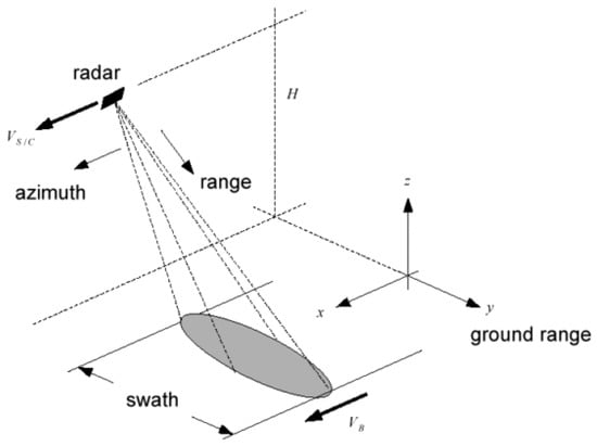 Figure 1 reports the acquisition geometry of a SAR system. The synthesis procedure in focusing the acquired data is carried out by coherent integration. Each target on the ground contributes to the radar return on several subsequent transmitted pulses. In SAR two main directions are important to focus the data: slant range direction, in which transmitted pulses travel, and azimuth direction, i.e., the direction of sensor movement. The precise knowledge of the geometry of the acquisition allows to add in phase all the contributes of each single point scatterer on the ground present in the data to obtain the focused image. The wider the beam, the smaller the detail acquired by any return, but the larger the integration size of the track contributions to synthesize the image. The practical azimuth resolution is limited by the PRF choice (the Pulse Repetition Frequency of transmitted pulses used for coherent illumination of the target area), i.e., the azimuth sampling frequency.
