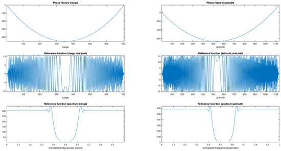 Figure 5 reports the obtained reference functions used to focus on range and azimuth the raw data. Figure reports the range (left column) and azimuth (right column). On the rows, the phase, the real part, and the spectrum of each reference function is presented.