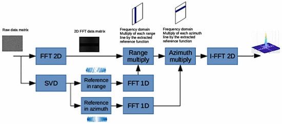 Once the azimuth and range reference functions have been defined, focusing can become simple and can be carried out with either RD or -K algorithms. In this paper, the frequency approach has been used to obtain the focused image.