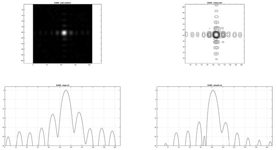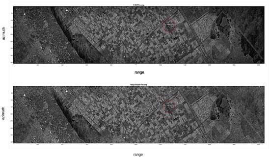 The better appearance on the focused image is due to the normalization process. The images have been normalized with the same algorithm that amplifies the focused revealed image to a fixed value after normalization to the standard deviation of the whole image. The appearance of the image brightness is different because of the circular convolution in the Range Doppler procedure due to the frequency domain processing (its effect can be noted on the horizontal axis due to the presence of a periodic structure in the image that folds around the image). No zero padding was used in this procedure in the Range Doppler focusing software, while in the proposed algorithm the zero padding was used both in range and azimuth directions to avoid the circular convolution distortion. This reduces the amplitudes of large portions of the image, giving rise to a lower standard deviation and in the normalization a higher factor. This higher factor enhances very much the point scatterer that appears larger on the image, but the range and azimuth cuts in