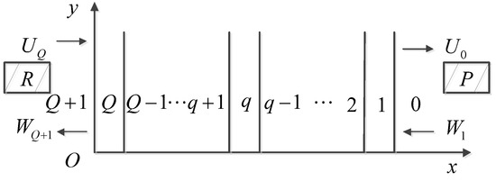 The scheme of the parametric layer model is depicted in Figure 1. The multi-layered media consists of layers, namely, layer . Two transducers and are placed in medium 0 and . and are corresponding transmitted signals and and are received signals of and , respectively. In the pulse–echo model, only one transducer exists; here we set it as , thus, . Apparently, becomes the frequency response function of the laminate if we set the pressure amplitude of as 1.