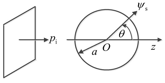 The scattering model depicted in Figure 2 illustrates the case where an incident wave is scattered by a spherical void (medium 2) with radius . Suppose that the velocity of P-wave and S-wave in the matrix (medium 1) are and , respectively, then: