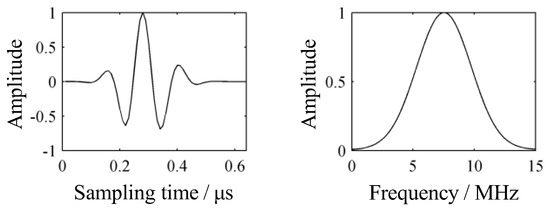 The center frequency of the transducer used in the simulation was 7.5 MHz. The transmission pulse signal and normalized spectrum of the transducer are shown in Figure 3.