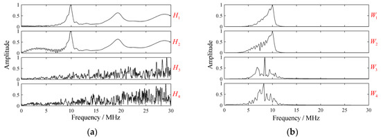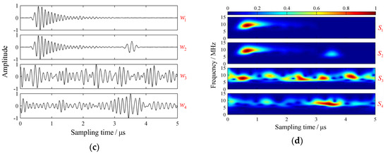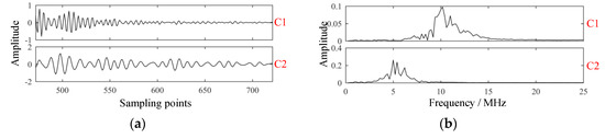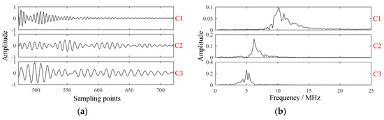 The structural signal with resonance frequency around 10–12 MHz and a flaw echo with center frequency around 5–6 MHz could be detected clearly in Figure 8c. To investigate the modes individually, we used VMD for modes extraction.