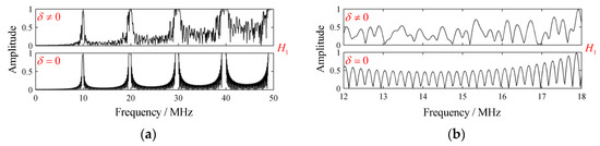 So there existed MHz, which coincided with the simulated structural signal well. A sufficient bandwidth was essential for excitation of strong resonance signal. Due to the attenuation in the laminate, the structural signal declined and disappeared. The with no attenuation occurring is presented in Figure 5a, where periodic spectral peaks can be observed, showing accordance with Equation (23). As a supplementary example, the special case, where the variations in ply thickness were omitted, was presented as well. It can be seen that the variations in ply thickness strongly increased the complexity of , whose local enlarged drawings within the frequency intervals 12~18 MHz are presented in Figure 5b for clarity.