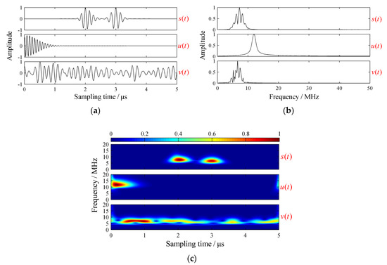 Simulated results of a simplified backscattered signal model. (a) Waveforms; (b) spectrums; and (c) GST spectrums.
