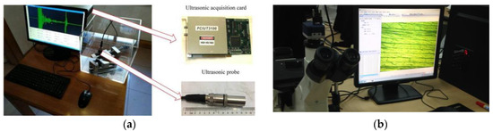 Experimental system. (a) Ultrasonic test system; (b) metallographic microscope system.