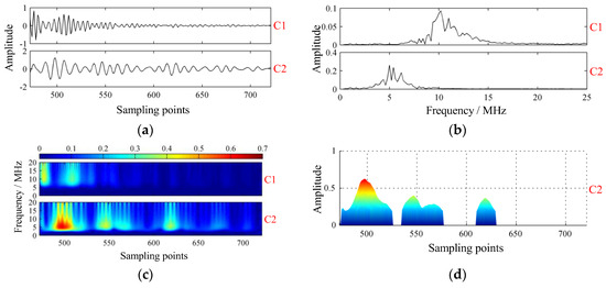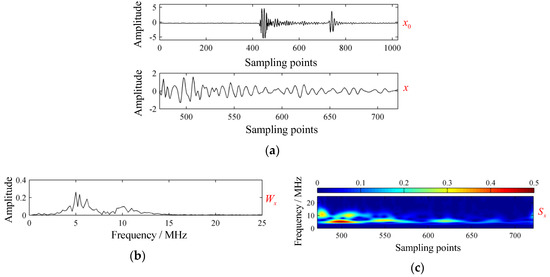where and were the central sampling points of the front-wall echo and back-wall echo. Here, we did not use the sampling points where the ultrasonic wave first arrived at the front-wall and back-wall to keep consistency with the defect localization method described later. In Figure 8a, and could be obtained, thus MHz.