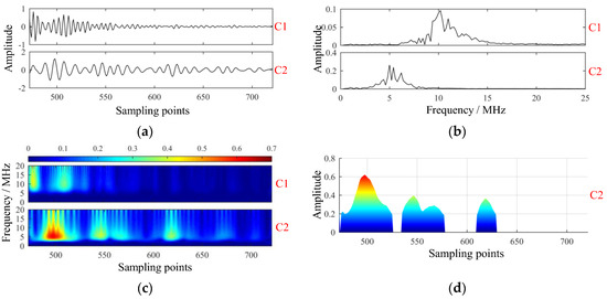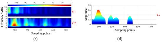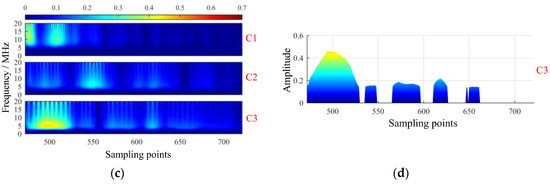 Conversely, modes were extracted by VMD successfully. As shown in Figure 9, C1 was the structural signal, and C2 was made up of scattering signal and flaw echoes. In Figure 9c, four local defects were revealed from the GST spectrums. To decide the locations of defects, a threshold operation was first performed on the GST spectrum, and projection of GST spectrums onto the time-amplitude plane was implemented subsequently, as shown in Figure 9d. From Figure 9d, the sampling points of those four defects were 497, 546, 567, and 619, respectively. Correspondingly, defect plies could be estimated by: