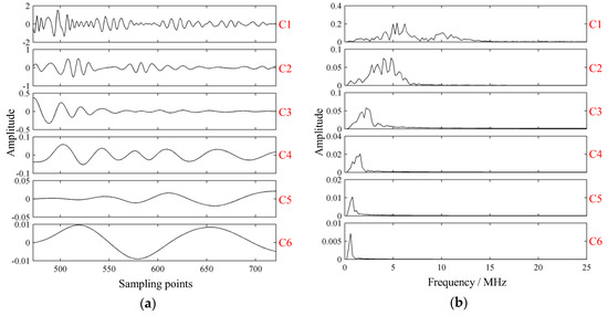 Clearly, results obtained via EMD suffered mode mixing in C1 and some false modes could also be detected. As shown in Figure 10b, EMD was a screening process from high to low, with the frequency of each component decreasing successively, and the frequency of C2–C6 approximately satisfied the binary filtering characteristic. In the process of EMD, mode mixing occurred, and some components of C2 were decomposed to C1. In this way, C1 became a multi-component signal, whose main components included resonant structure noise and components close to the probe frequency, while C2 was damaged. The occurrence of mode mixing meant that the decomposition results of EMD were not ideal.