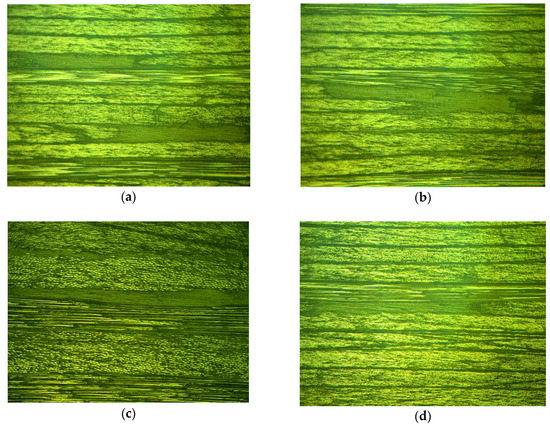 Rich-resin areas in the specimen. (a) Layer: 10 and 14; (b) layer: 25; (c) layer: 31; and (d) layer: 42.