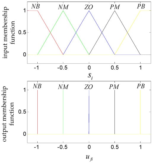 where is the row element of the sliding mode function , that is . Furthermore, are the outputs of the fuzzy inference system.