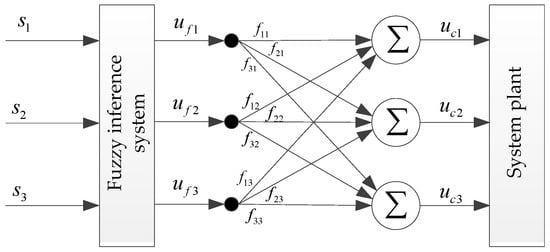 where is the output compensation control amount; is the real coefficient matrix, ; and is an adaptive compensation coefficient matrix. The second item in Equation (25) is the output of fuzzy control introduced for the coupling between the three frameworks of the platform.