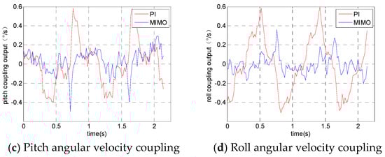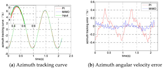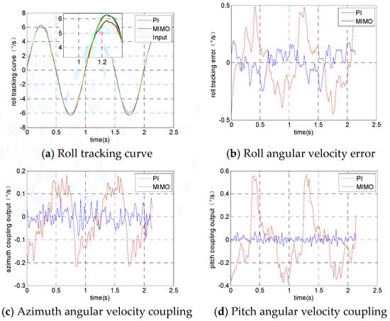 The experimental results from the azimuth frame tracking the input signal are shown in Figure 7. Figure 7a is the angular velocity tracking curve of the azimuth frame, Figure 7b is the azimuth frame tracking error curve, Figure 7c is the actual angular velocity output of the pitch frame and Figure 7d is the actual angular velocity output of the roll frame.