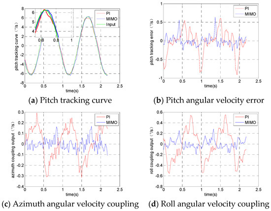 The experimental results from the pitching frame tracking the input signal are shown in Figure 8. Figure 8a is the angular velocity tracking curve of the pitching frame, Figure 8b is the tracking error curve of the pitching frame, Figure 8c is the actual angular velocity output of the azimuth frame and Figure 8d is the actual angular velocity output of the rolling frame.