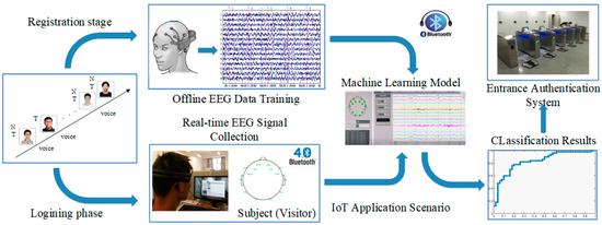 In order to address the above problems, researchers have begun to focus on the novel IoT devices based on electroencephalography (EEG) signals [9], which can be used to authenticate in intelligent entrance systems for home or industry [10]. First, EEG signals are generated from the brain, and cannot be copied or stolen by current technologies. Second, since the individual’s brainwave is greatly affected by specific pressures or stimuli [11], an imposter‘s brainwave activities are usually ineffective. Furthermore, the brainwave has many special properties, such as high time resolution and high uniqueness [12]. Therefore, the authentication method based on EEG signal devices has significant advantages over the traditional authentication methods, and it can be applied in more reliable IoT authentication system based on machine learning technology [13].