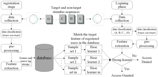 In the registration phase, the first step is to acquire the signals. The subject selects the target source stimuli as a password, records the EEG signals that respond to the target source stimulus via the EEG device, and sends the EEG signal data to the terminal via a wireless Bluetooth module for further processing. The EEG signals are divided into target sources and non-target sources. Then, the target features and non-target features are extracted by pre-processing and feature extraction. In order to evaluate the performance of the system, some of these features are considered as training feature sets, and others are used as test feature sets. Finally, the target feature data set and source tag will be stored in the database.