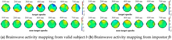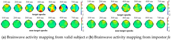 We completed the above experimental paradigm analysis on all of the subjects (visitors) where one impostor is randomly selected for each subject. Due to the space limitations, we only show the experimental results of two subjects and their corresponding impostors. The valid subjects a, b and their impostors fa, fb respectively perform the above-mentioned experiment, in which a, b select their own information as the target source, while the impostors fa, fb select the information of a, b as their target sources. The two types of event-related potentials can be obtained from Figure 4 and Figure 5, where the brainwave activity mappings of target and non-target source stimulation from valid subjects and their corresponding impostors can be depicted through the EEGLAB tool. In fact, by the observation of the brainwave activity mapping, the color change of the gradient pole (i.e., vertical bar in Figure 4) can be recorded. The amplitude of the brain wave in the current region, which is represented by the red color, shows a high-value state. On the contrary, the blue color represents the state in which amplitude is low. Among which the number at the top of the figures represents the current timestamp of the brainwave activity mapping.