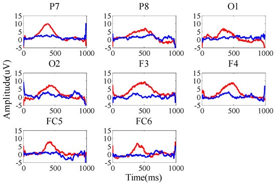 According to Equation (3), the larger r(t) value is an important metric for selecting the channel and time interval. For each channel, the mean square value of r(t) in T time interval will be sorted in descending order. Then, the top eight channels will be selected. In our experiments, F3, F4, FC5, FC6, P7, P8, O1, and O2 are selected as the electrode channels. The event-related potential waveforms are shown in Figure 6.