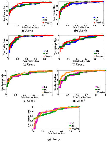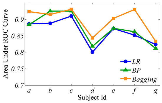 Figure 7 presents the comparisons of ROC curves for the three classifiers from the selected seven subjects a–g, and Figure 8 shows the AUC surrounded by the three learners from the same seven subjects.