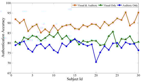 In our experiments, the subjects perform the visual and auditory paradigm in a open environment due to the constrains of experimental conditions, so there are many uncertainties in the test process: (1) the mental state of the subject may be bad; (2) the subject cannot correctly follow the authentication instructions of the experimental paradigm; (3) improperly wearing the EEG device can cause inaccuracies in the data acquisition; or (4) the surrounding noises may interfere with the subject. Furthermore, we find that the 64-electrode EEG devices may achieve the higher precision but they are expensive; for example, the price of the NeuroScan device is between $13,000–15,000. In contrast, the cost of our proposed EEG device is not very high; therefore, the accuracy of the collected data has a certain limitation.