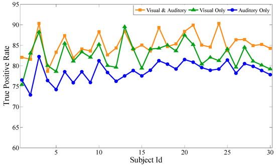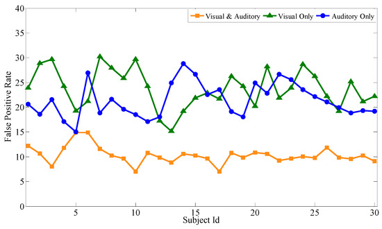 Based on the above experiments, the proposed feature selection method together with the bagging classification method forms the best combination, which will be used to evaluate the performance of the audiovisual paradigm, the single visual paradigm, and the single auditory paradigm, respectively. Similar to the audiovisual paradigm, the single visual paradigm and the single auditory paradigm will be conducted according to the experimental scenario in Section 3. Particularly, during the selection of stimuli source, only visual or auditory stimuli are selected. Except for this, the selection of optimal channels, optimal time intervals, and optimal feature subsets are all based on our proposal. Each subject performs the same experiment several times to obtain mathematical expectation. Aiming at 30 subjects, after 100 experiments, Figure 9, Figure 10 and Figure 11 respectively show the average classification accuracy rate, precision rate (true positive rate), and false positive rate of the three paradigms.