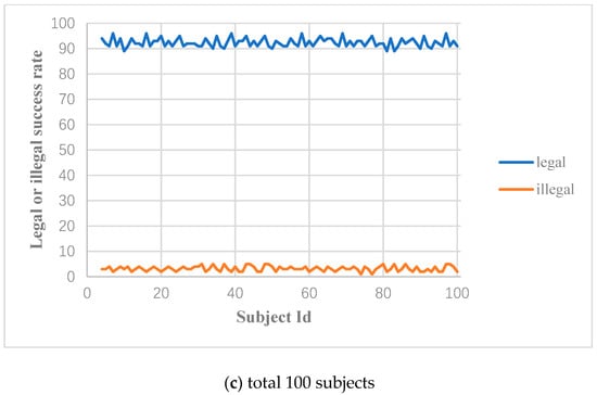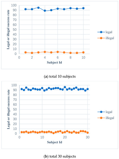 In the experiment, mathematics expectations can be achieved by carrying out 10 experiments for each subject. Figure 12 shows the legal success rate (the probability of the valid subject passing the authentication) and the illegal success rate (the probability of the impostor passing the authentication) of the subjects. The legal success rate of 10, 30, and 100 subjects are 92.4%, 92.13%, and 92.42%, respectively, and the illegal success rate of 10, 30, and 100 subjects are 2.9%, 3.2%, 3.17%, respectively. From the perspective of security, the higher legal success rate and the lower illegal success rate are expected by the entrance authentication system, which verifies the reliability and effectiveness of the authentication system.