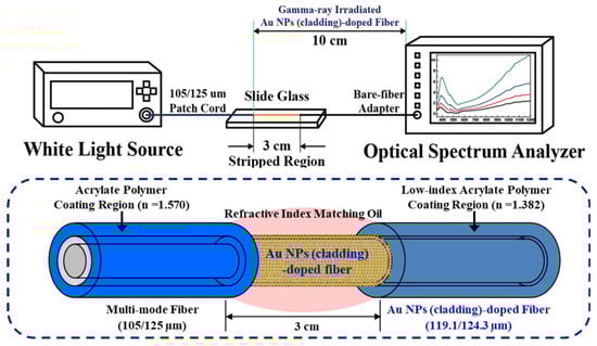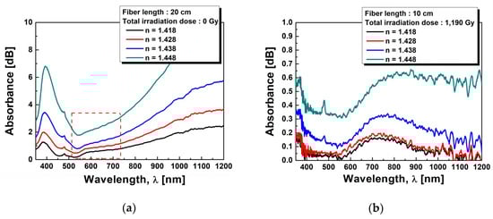 To characterize SPR sensing property, the change in optical absorption by the γ-ray irradiation was measured by putting small drops of the refractive index matching oil with various refractive indices (n = 1.418–1.448, Cargille Labs, Cedar Grove, NJ, USA) on the surface of the stripped portion (3 cm) of the 10 cm fiber (Figure 1). The coated polymer of the irradiated fiber was stripped off using acetone and the fiber was spliced with a commercial multi-mode fiber (diameters of core, cladding, coating were 105, 125, and 250 μm, respectively). The light was launched into the commercial multi-mode fiber with FC/PC-type connector for stable light supply and the resonance wavelength was measured by directly coupled to the OSA using a bare-fiber adapter without splicing with another fiber in order to minimize the signal distortion or intensity degradation at the other end of the fiber. Note that the change in optical absorption of the fiber without γ-ray irradiation was measured by using the fiber of 20 cm total length with the surface of the stripped portion (3 cm) according to the optimized fiber length for SPR sensor implementation derived from previous experimental results [].