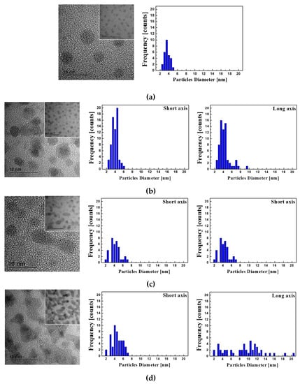 TEM images and size distribution of the major and minor axis lengths of the Au NPs incorporated in the cladding of the fiber (a) before and after the γ-ray irradiation at the total dose of (b) 1190 Gy, (c) 2380 Gy, and (d) 3570 Gy.